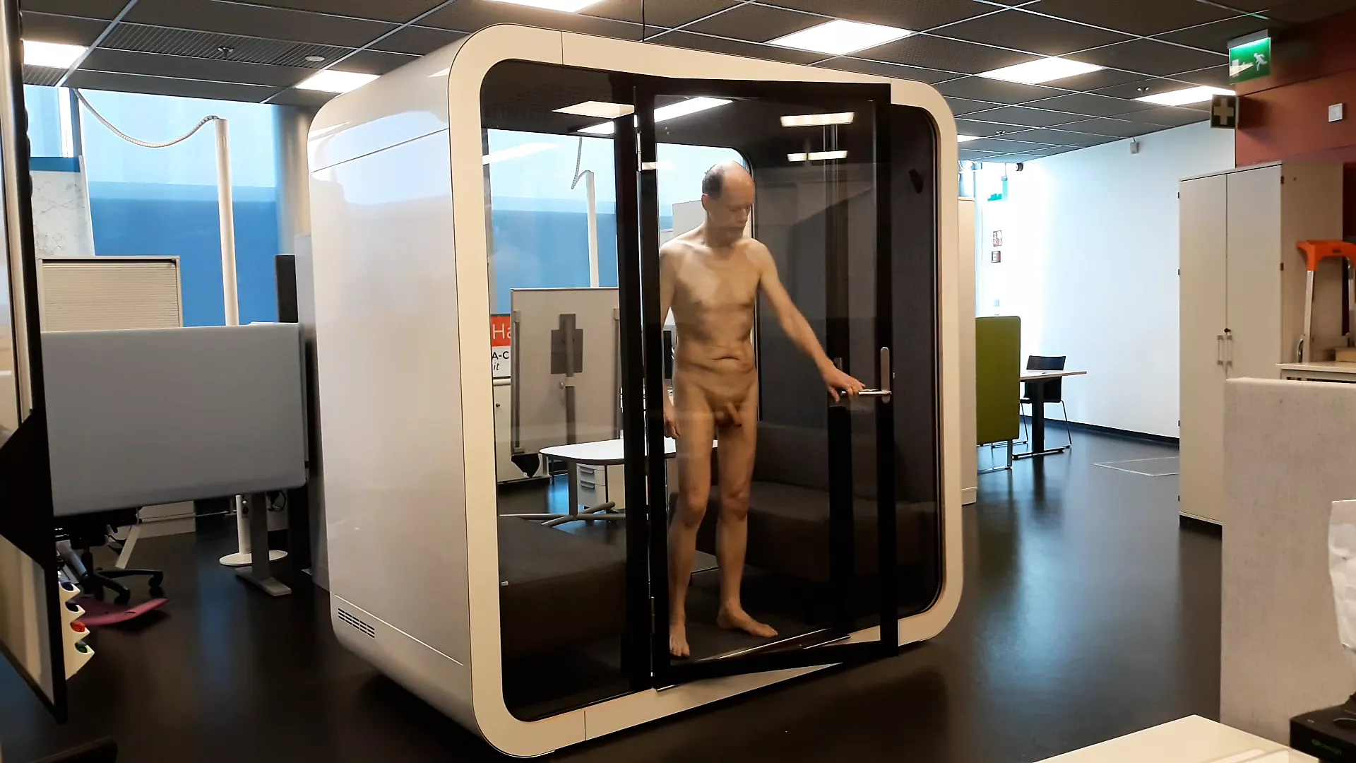 . Shamelessly stark naked in the office. High risk of being caught.