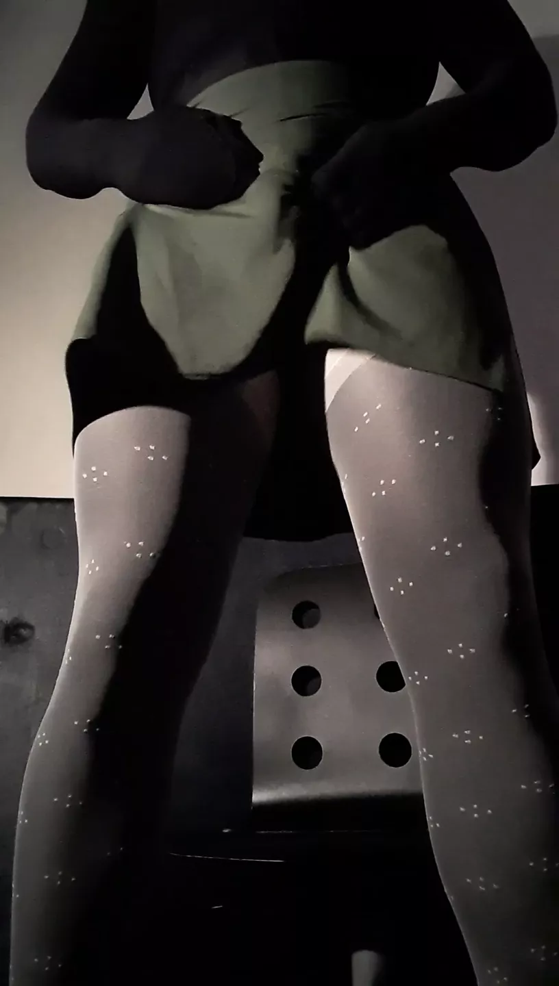. Playing in Black Nylon Encasement with black heels, nylon skirt and stockings.