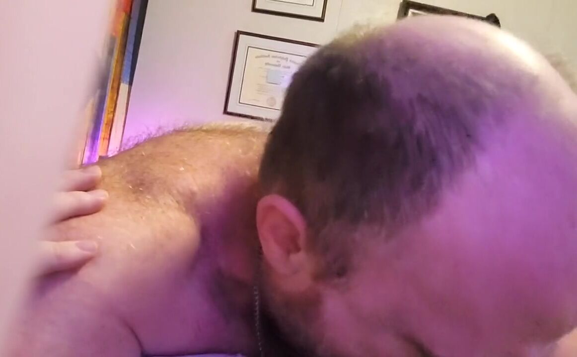 . Hairy daddy bear relaxes and relishes sucking Boys thick cock while occasionally showing off his hairy back or armpits, getting his ass fingered, and a nice handjob