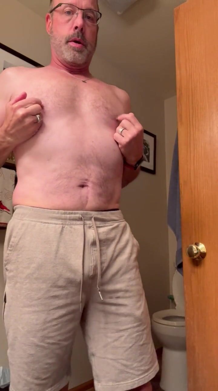. Daddy gets naked his softie wiggling, a few strokes plus teasing his nipples, gets rock hard, pointing straight up.