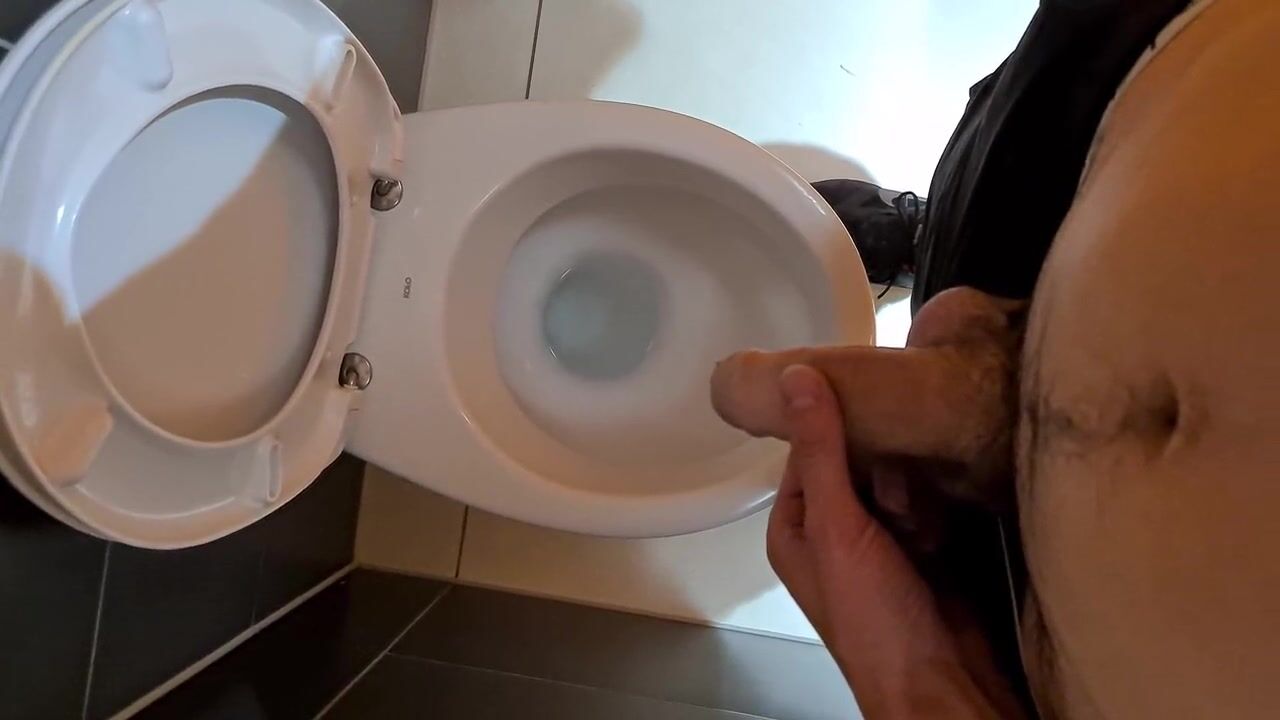. Horny man piss in the public toilet of shopping mall and play with his big dick ...