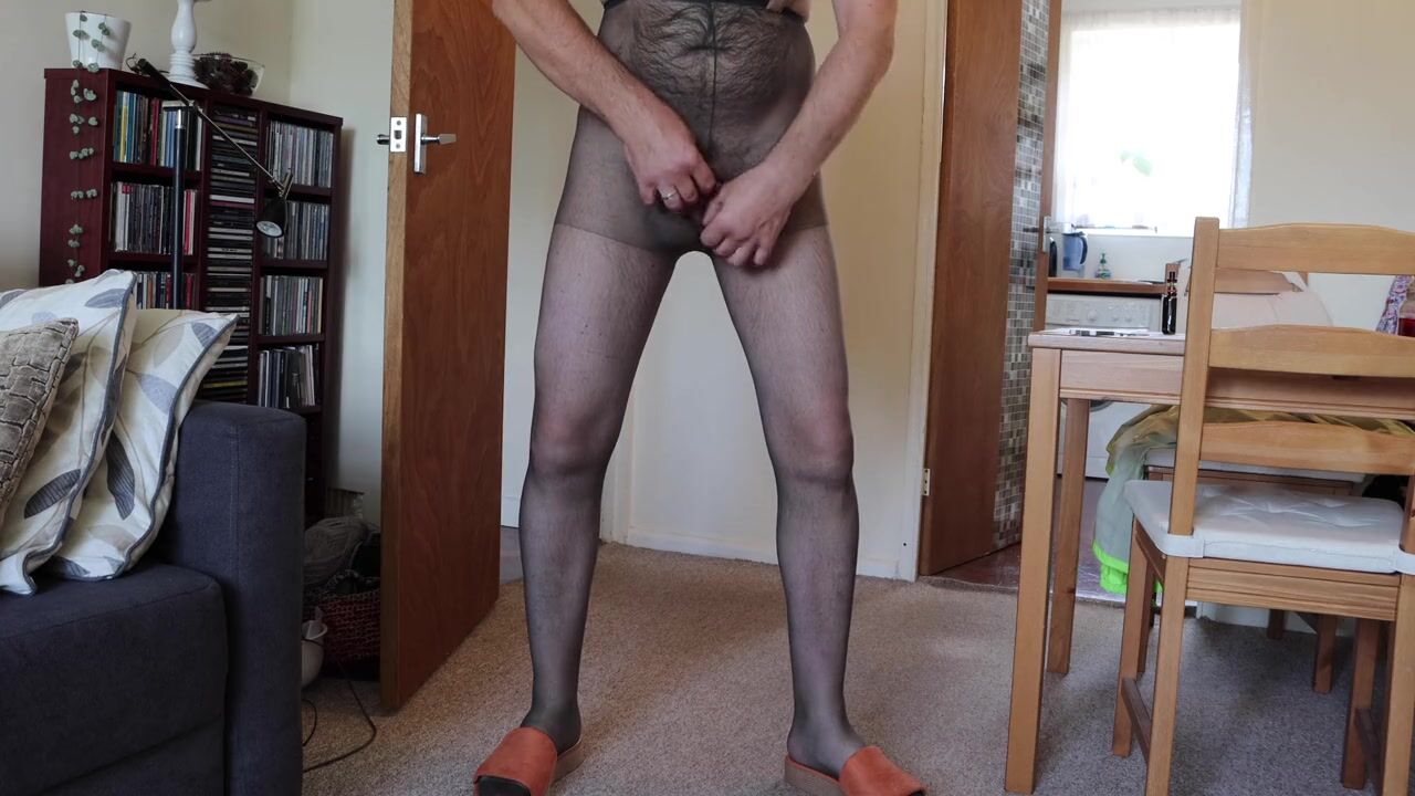 . Hairy crossdresser in black tights, pantyhose, showing hairy cock and big balls. Walking in women's slippers, sandals. Hairy chest and legs.