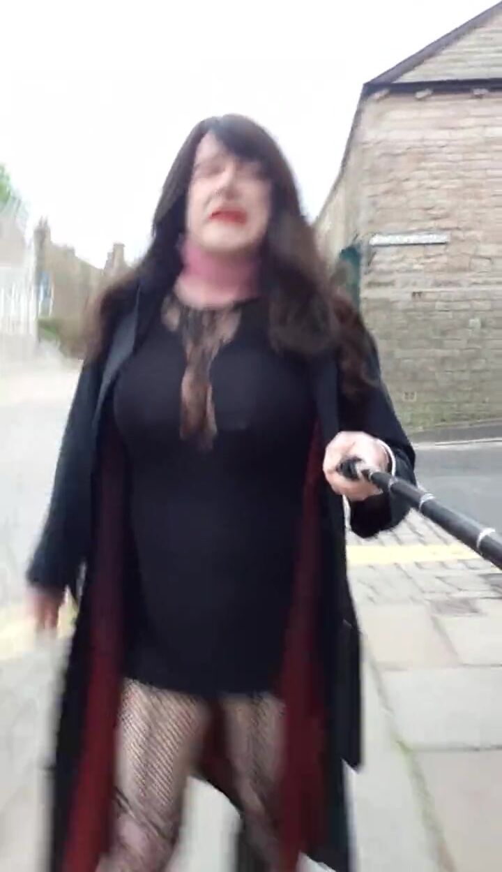 . Walking on the streets wearing a short black dress and patterned tights under my coat. I go past lots of shops and the bus station. I felt very excited walking round in public like this.