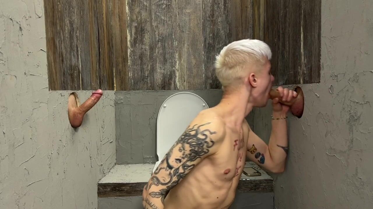 THE GUY JERKED OFF IN THE TOILET AND THEN HE WAS JOINED BY TWO PENISES IN HOLES