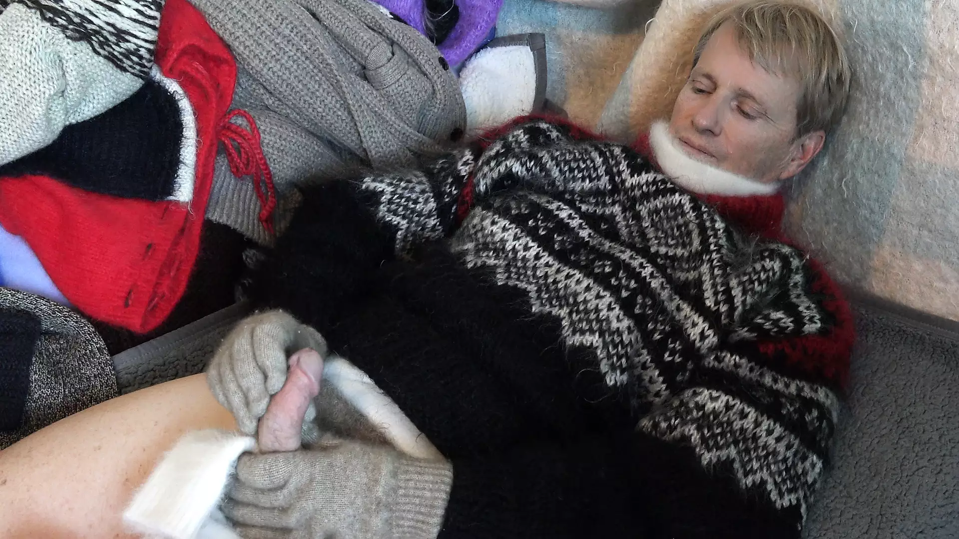 FUZZY MOHAIR SWEATER AND ANGORA TURTLENECK MASTURBATION FUN WITH CUM SHOT ON A SOCK WITH FUZZY GLOVES