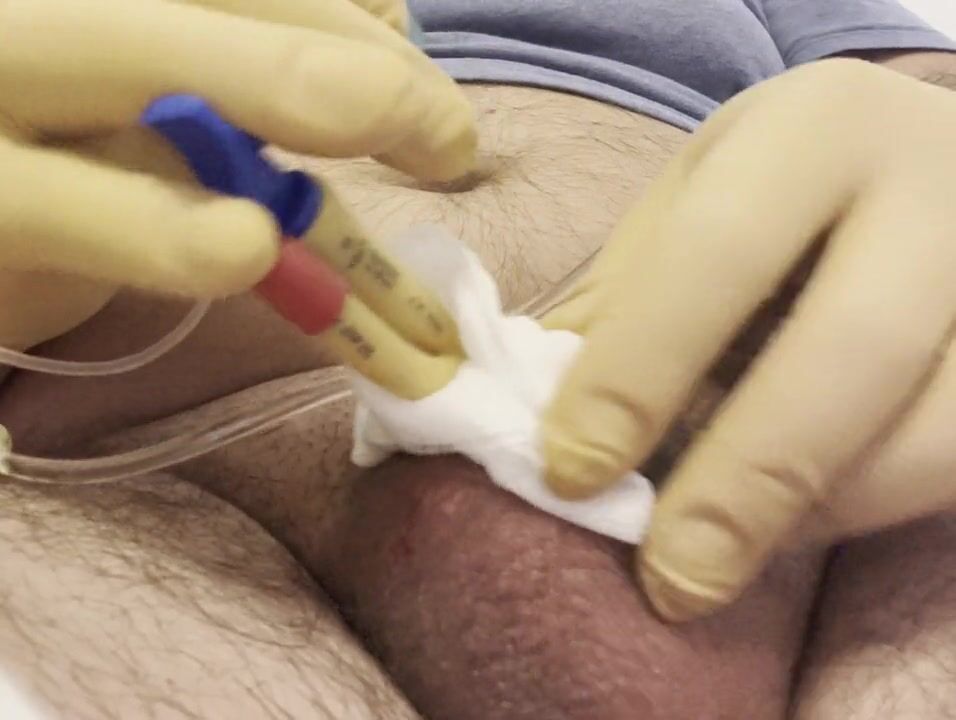 . Insertion of a large bladder catheter into a small cock with large balls filled with physiological saline. Very painful but necessary because prescribed by the doctor.