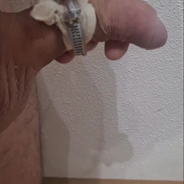 . I was so horny but didn't want to allow my cock to get hard. I found that hose clamp and used it to band my cock very tight. What a look, half errect, half limp. Let's hurry, it's getting numb.
