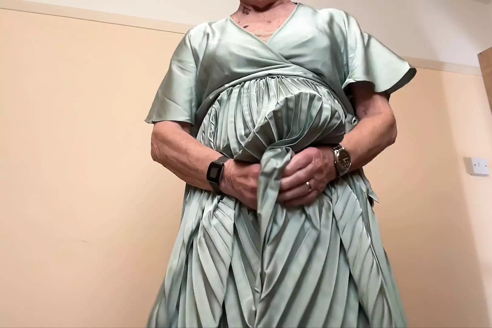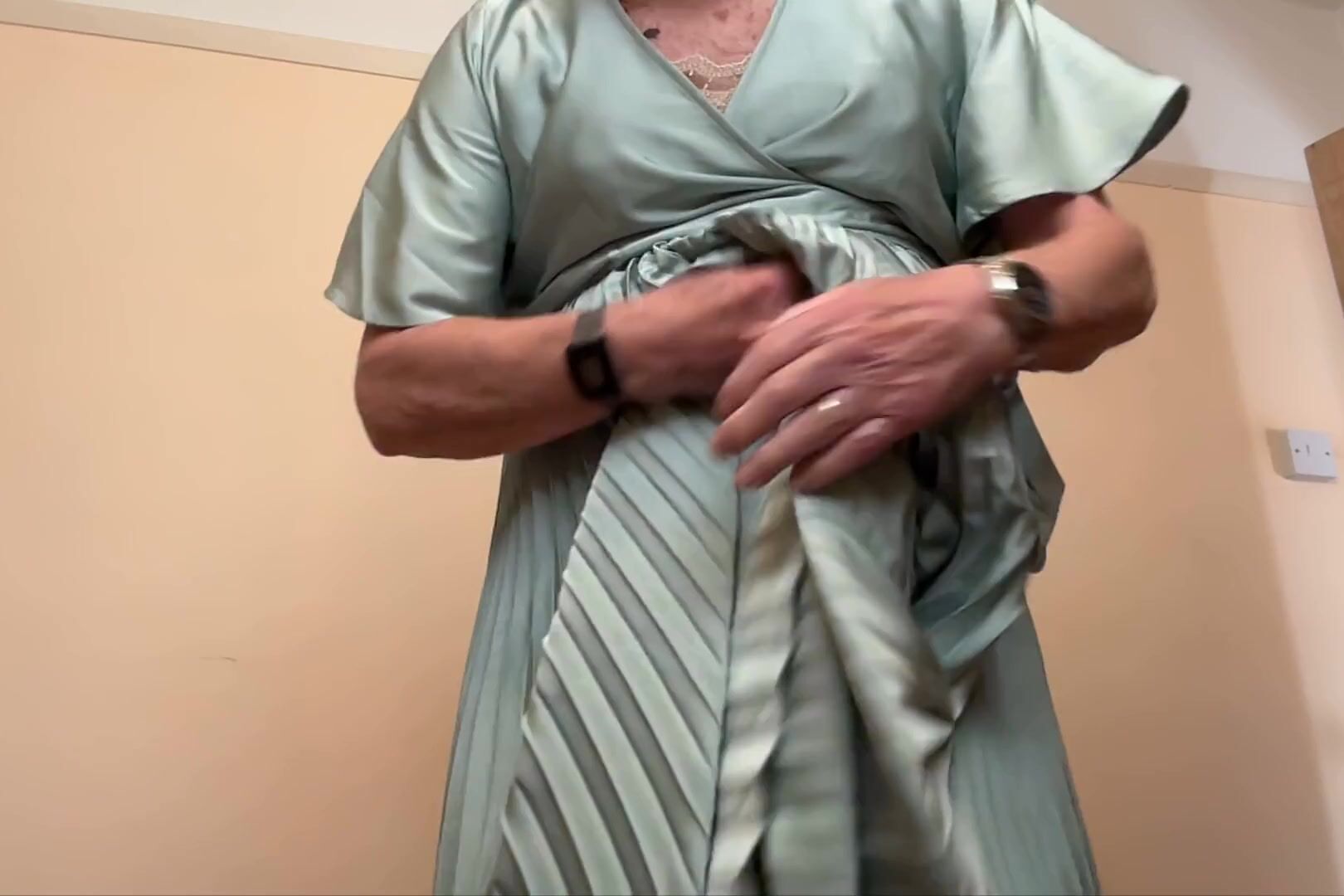 CUM WEARING MY PLEATED DRESS.