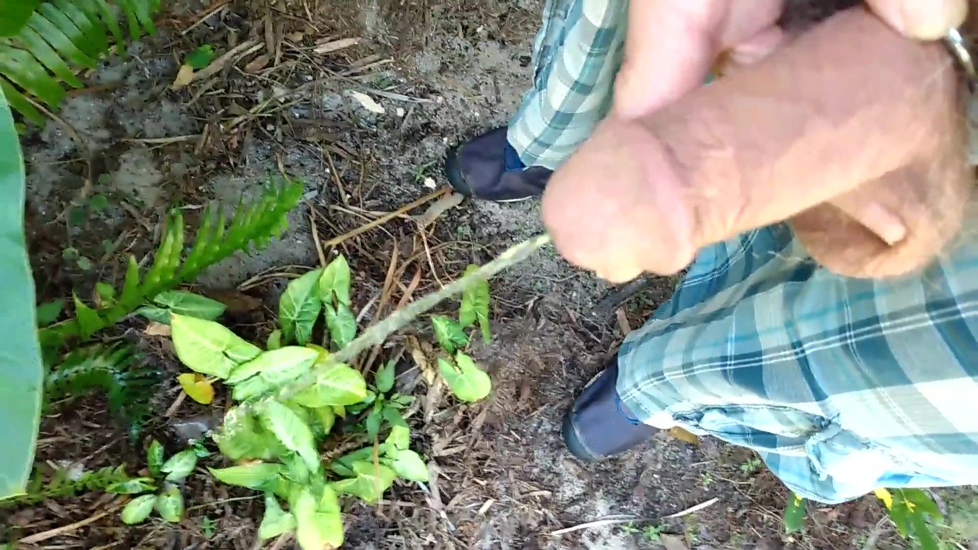 . I pee in a variety of locations outdoors, unzipping, dropping my shorts, sometimes keeping them on. One in the sink. On the last clip, I start jerking off and showing off my ass and hole.