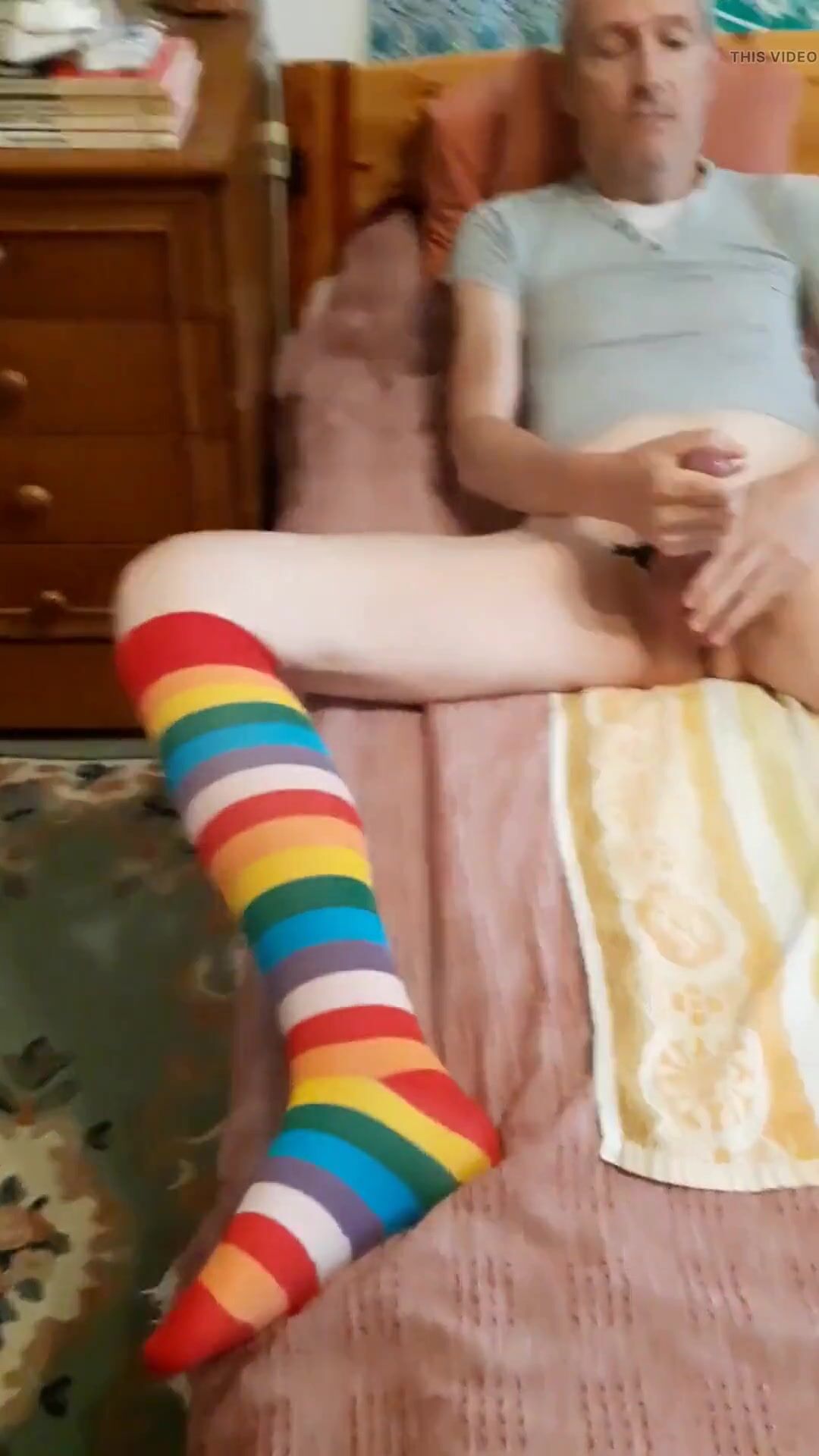 Very hairy skinny white guy in rainbow knee-high socks gives a realistic dildo footjob