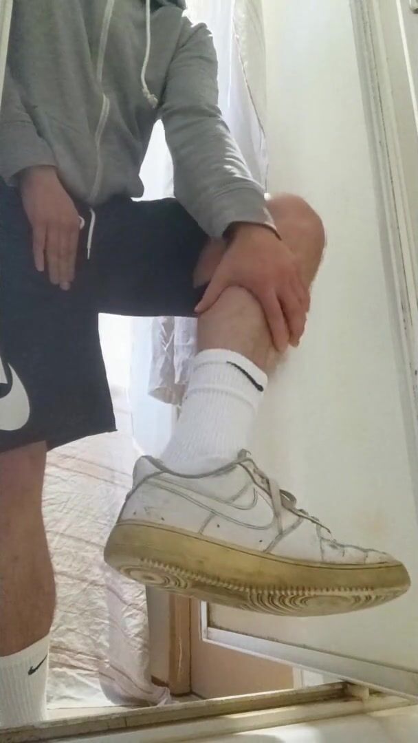. I piss my friend's shower and I put on these Nike Air Force to feel him inside me with these Nike socks. I touch my AF1s and my Nike socks, it's so good and nice.