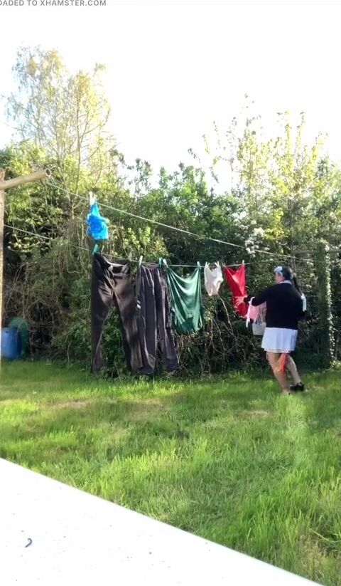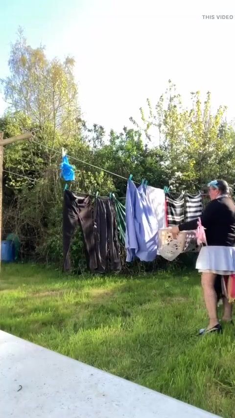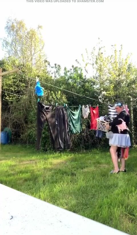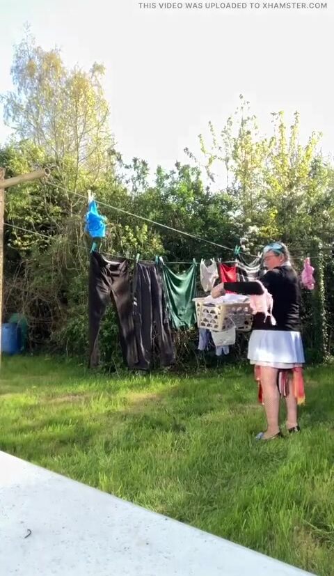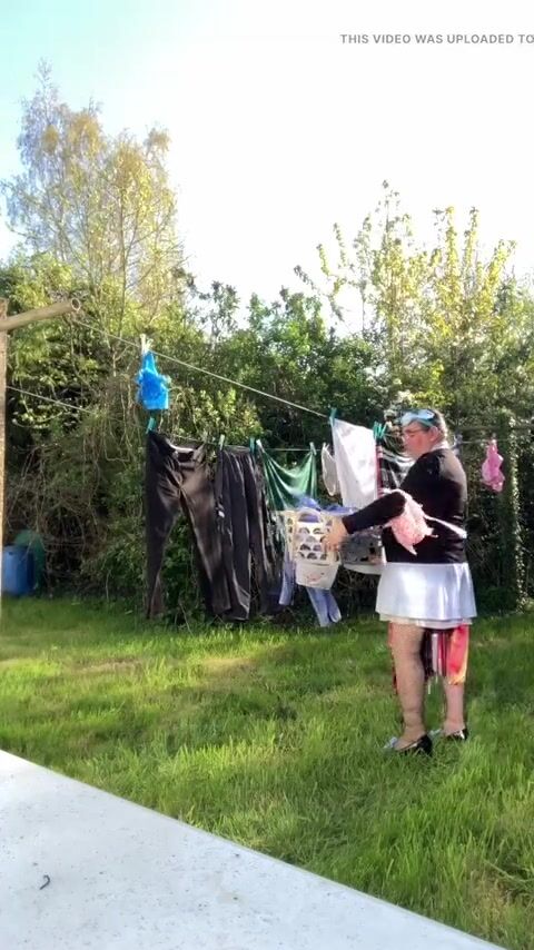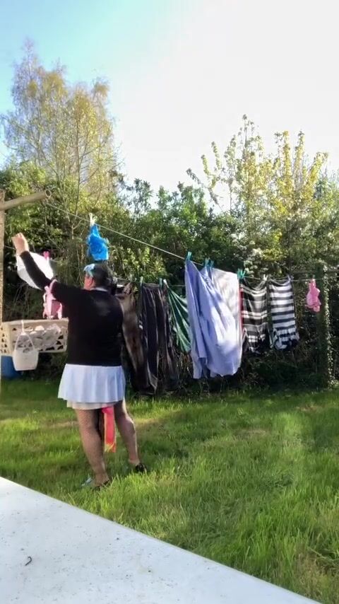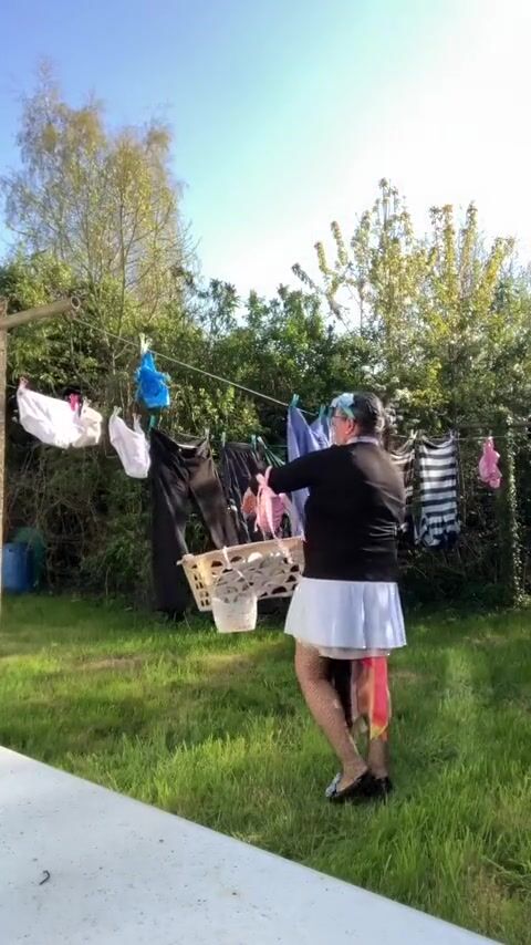 . In attire with a schoolgirl dress to gather laundry and for an evening out.